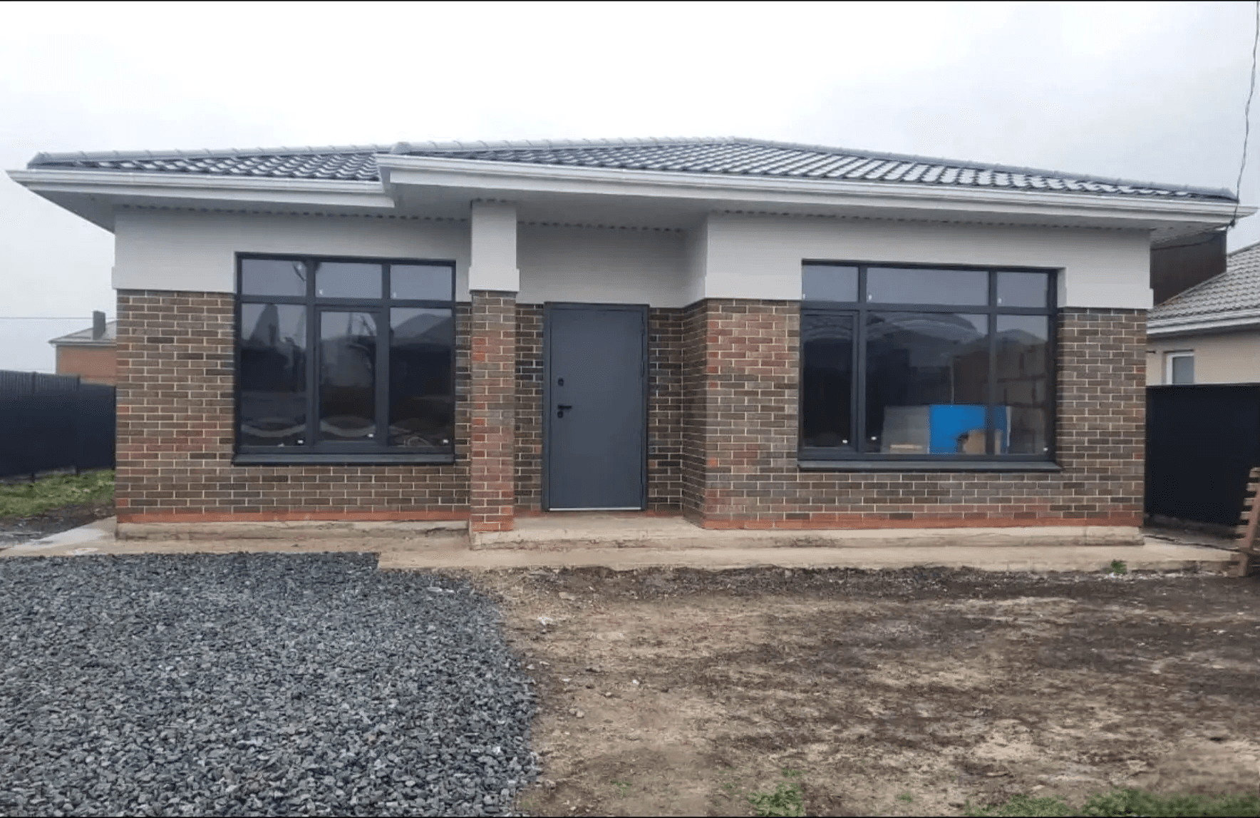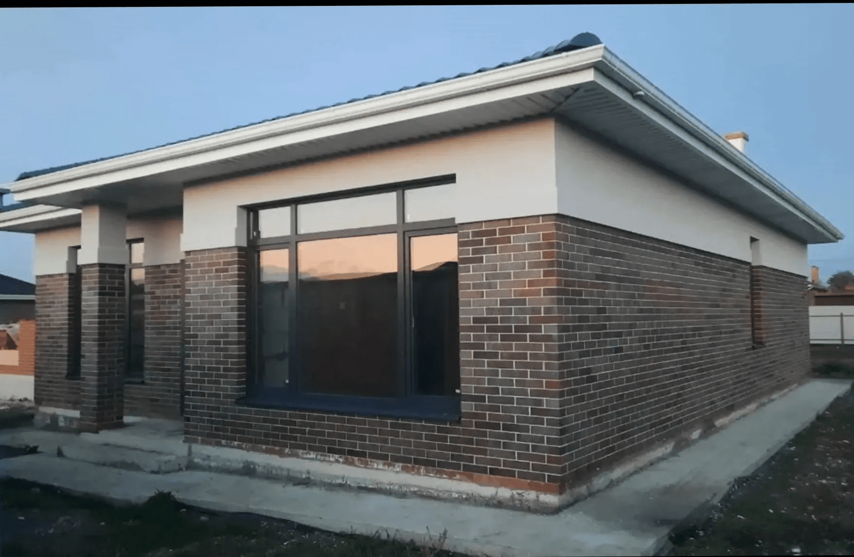 Уютный кирпичный или каменный дом с окнами сложной формы (арки, окна с раскладкой/шпросами внутри стекла) и красивой ламинацией
